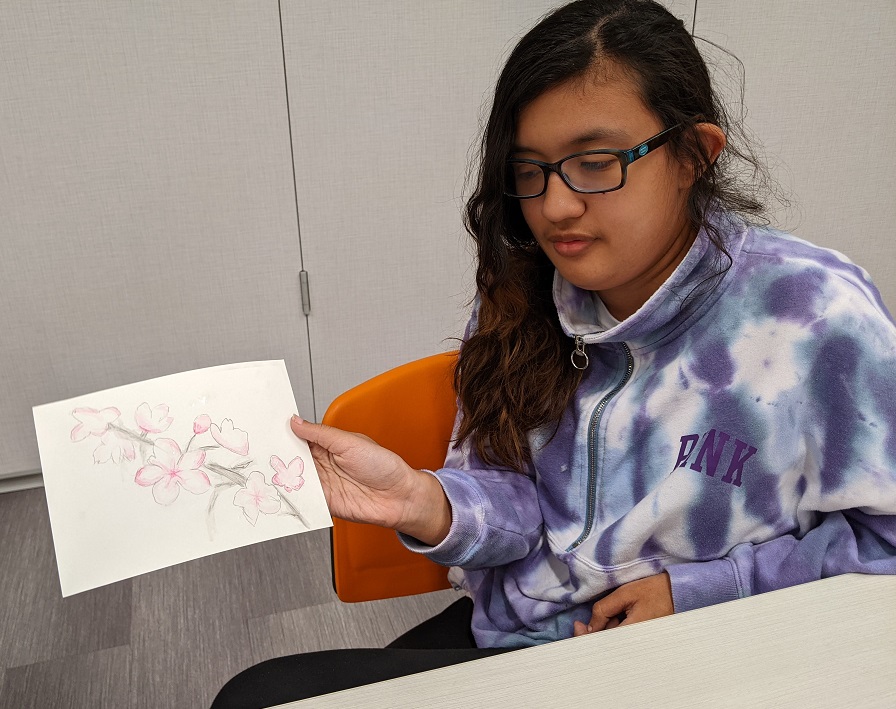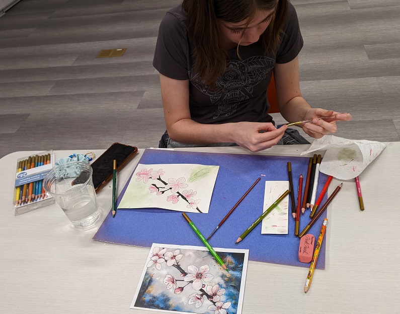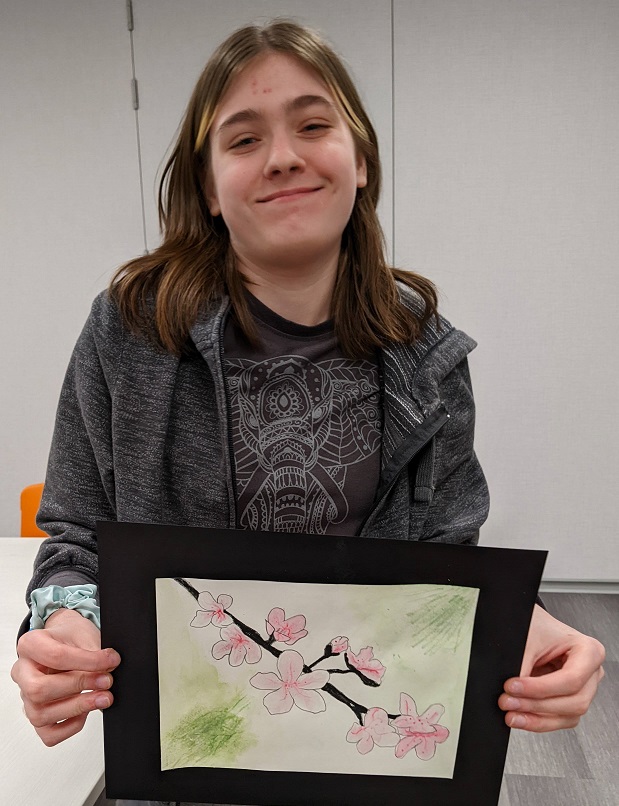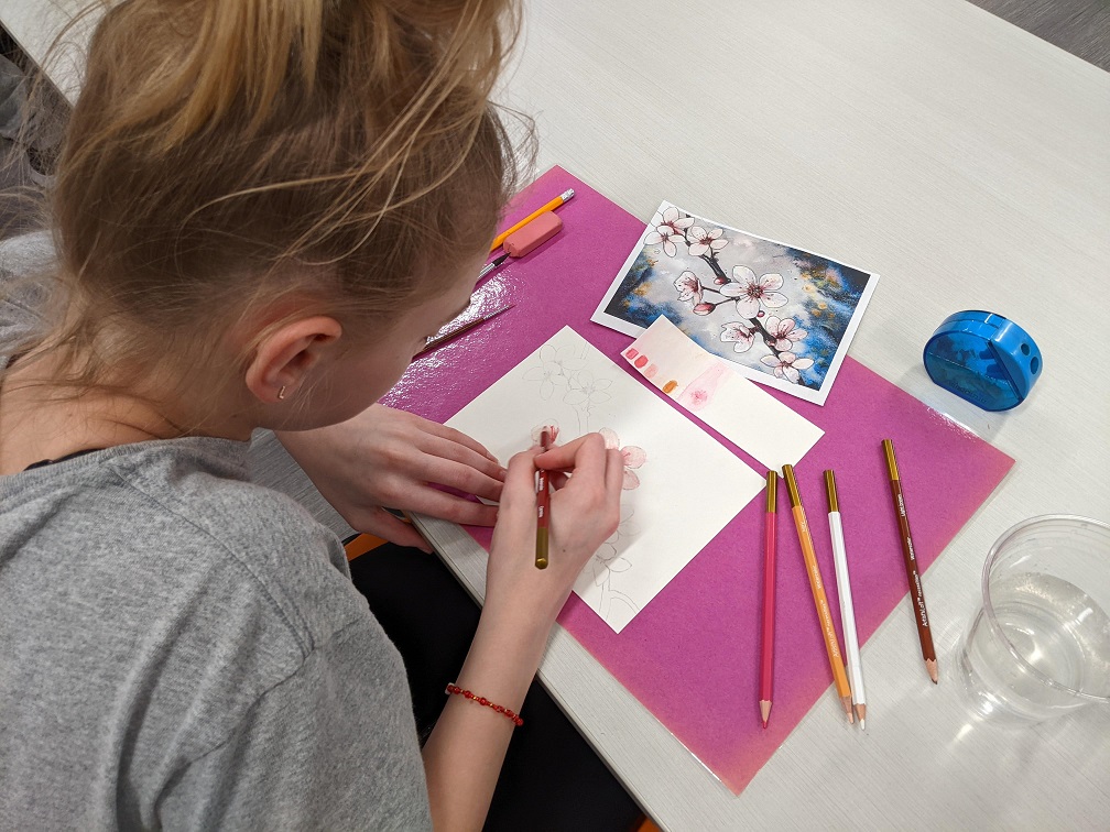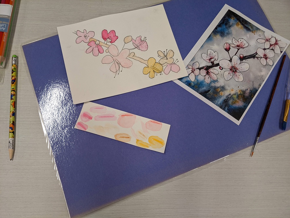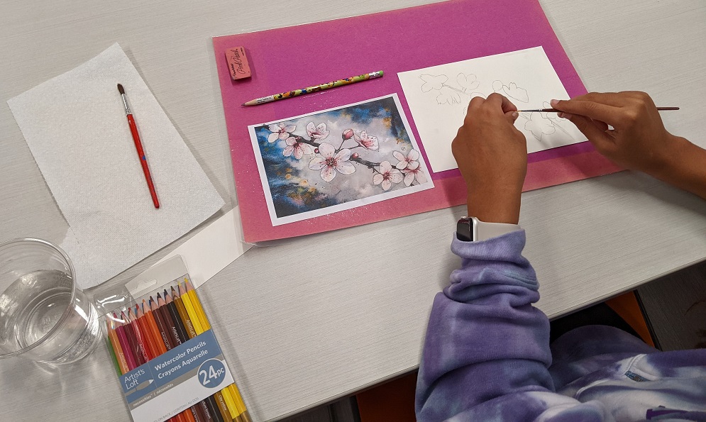 Using watercolor pencils, a reference image, and a clever pencil transfer technique for tracing the image, teens created their own cherry blossom masterpieces in watercolor. Even though they were all working from the same image, everyone’s turned out different. See their creations below: