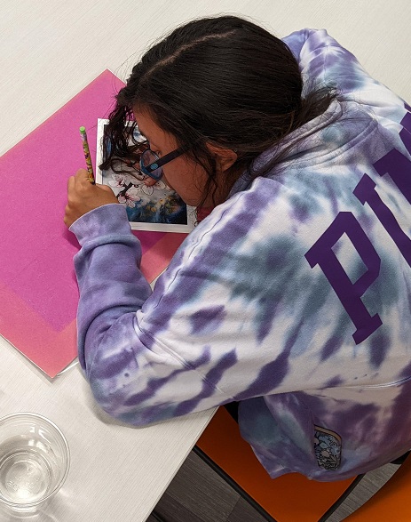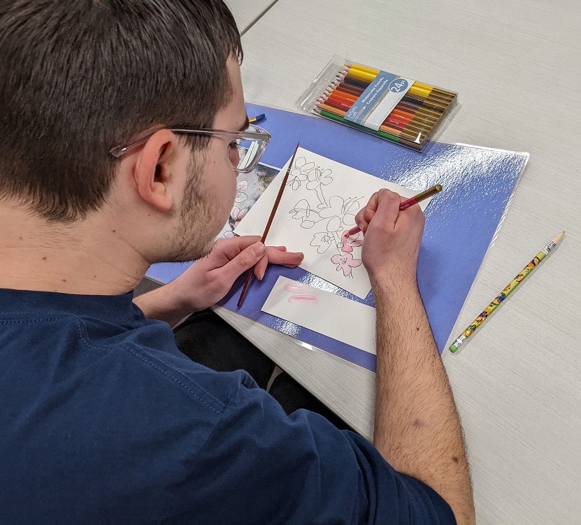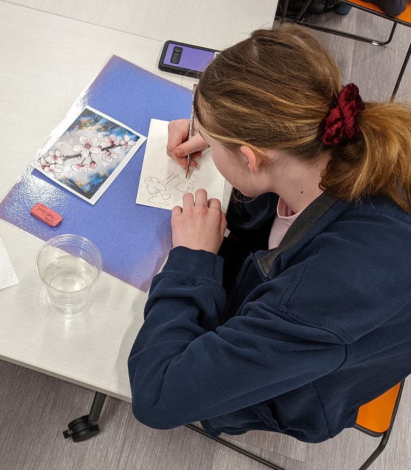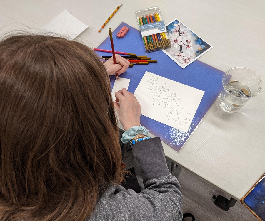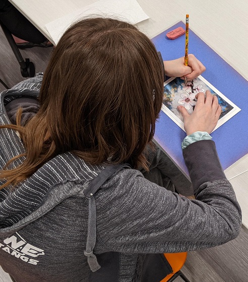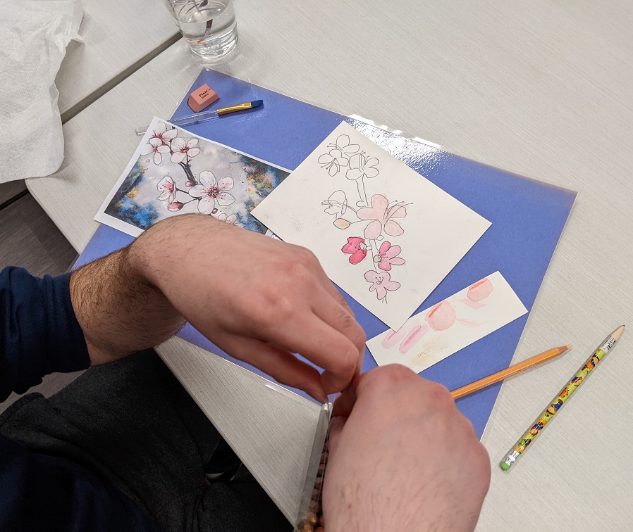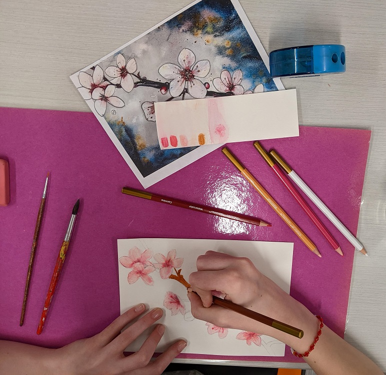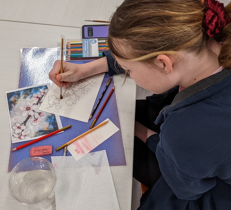 Using watercolor pencils, a reference image, and a clever pencil transfer technique for tracing the image, teens created their own cherry blossom masterpieces in watercolor. Even though they were all working from the same image, everyone’s turned out different. See their creations below: