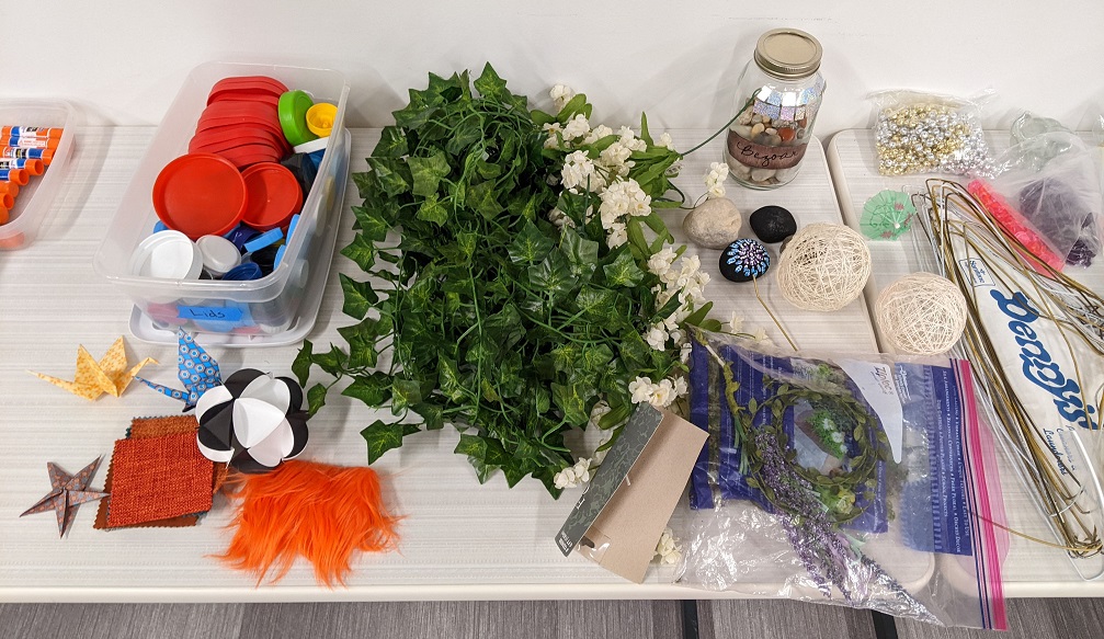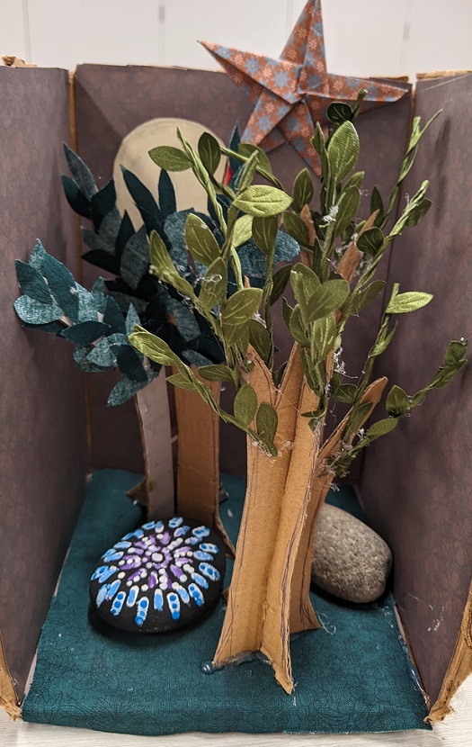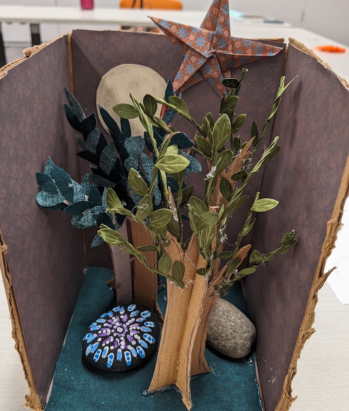There was a good registration for the return of our Craft Wars series, but only one teen was actually able to make it, so it was more of a Craft Duel! We didn’t share what we were creating until the end, and it was surprising to learn that we both incorporated tree/forest elements into our book nooks. What IS a book nook? It’s like a diorama that shows a scene of some kind (your choice, really, but it *could* be a scene from a book!) that you create in a box and then display on your bookshelf (among your books). Some people have designed some really impressive scenes, including fairy lights and miniature pieces of furniture. Getting creative with the supplies on hand was part of the challenge for our event. See what we made below: