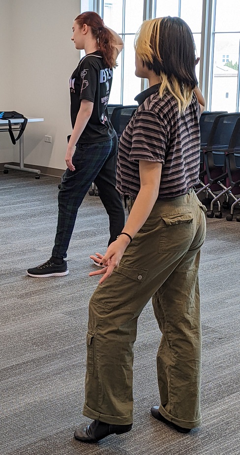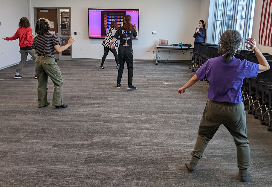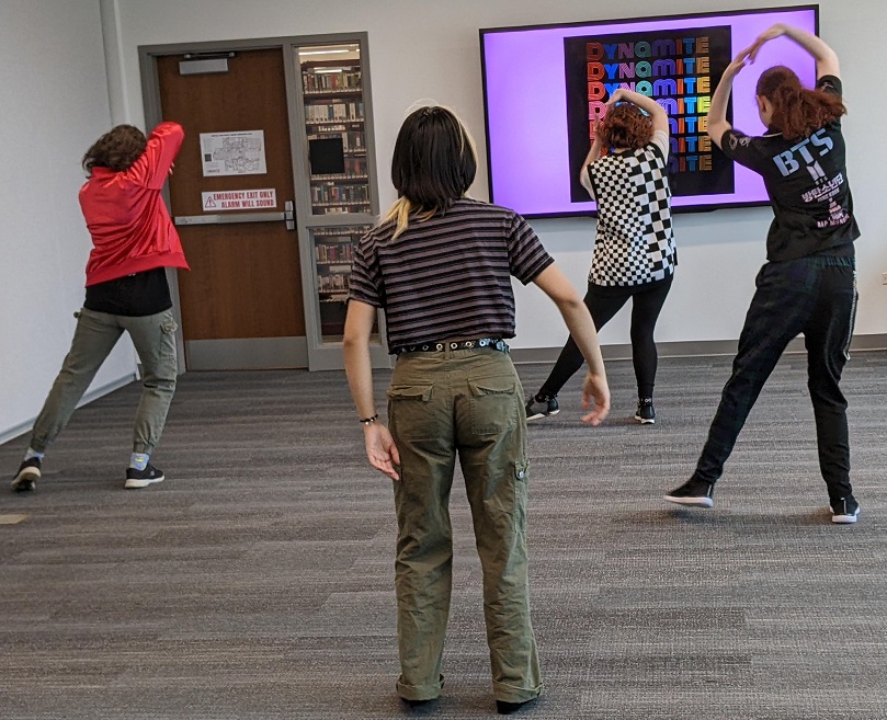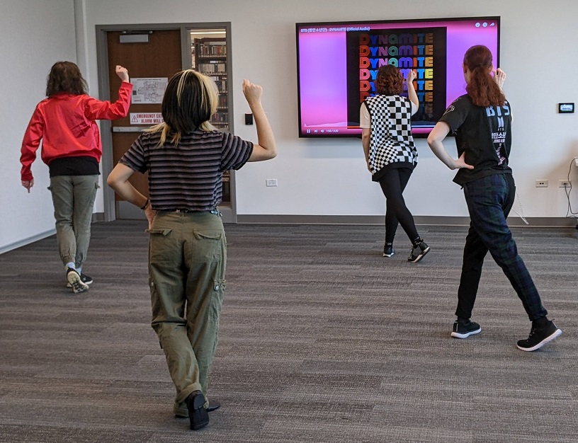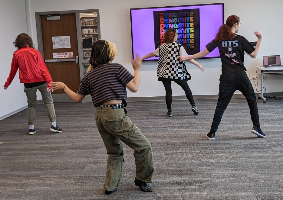 Teens (and some brave adults) learned some choreography to BTS’s “Dynamite,” this March (2023) from Melanie Andersen, dance instructor (Turning Pointe Academy of Dance in Elgin). Everyone picked it up really quickly and challenged themselves at the end of class to speed things up – double time – with some hilarious results. Check out some photos from the event below!