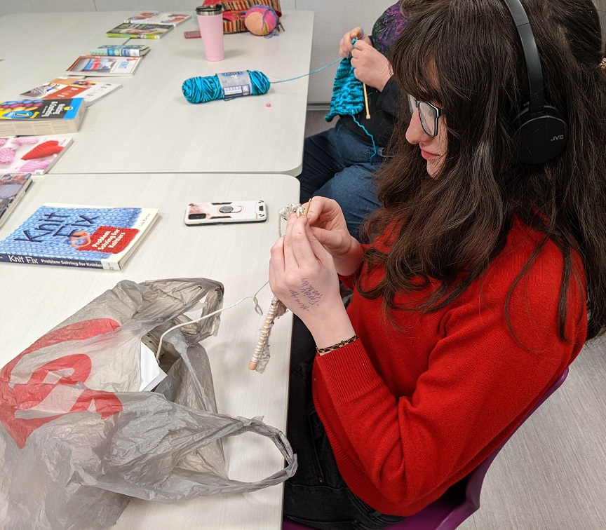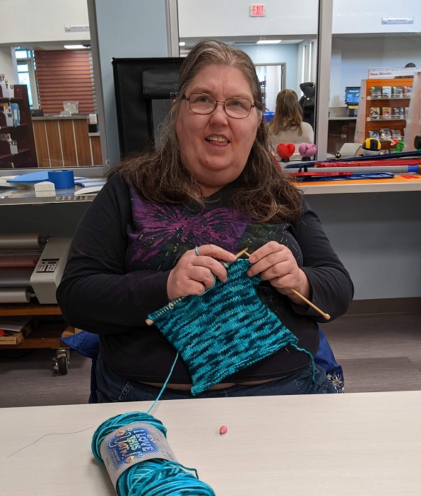 Teens learned to knit this month in a series of 3 classes covering some knitting basics: yarn and needle selection, casting on, knit stitch, adding rows, binding off. We didn’t *quite* meet our goal of completing a scarf, but participants made some good progress on their projects! Our knitting instructors included library staff and a volunteer from The Fray (the library’s adult stitchery club). Photos from one of our classes below: