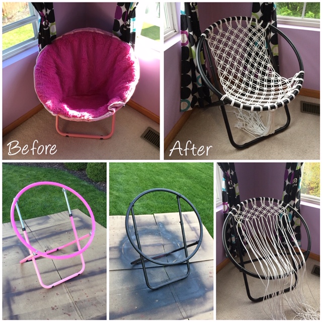 “I had a saucer chair in my room for as long as I can remember and it’s been ripping slowly over the years, so I decided to fix it up. I ripped off the fabric, painted the frame, then used macrame knots on ropes to turn it into a hammock chair!”