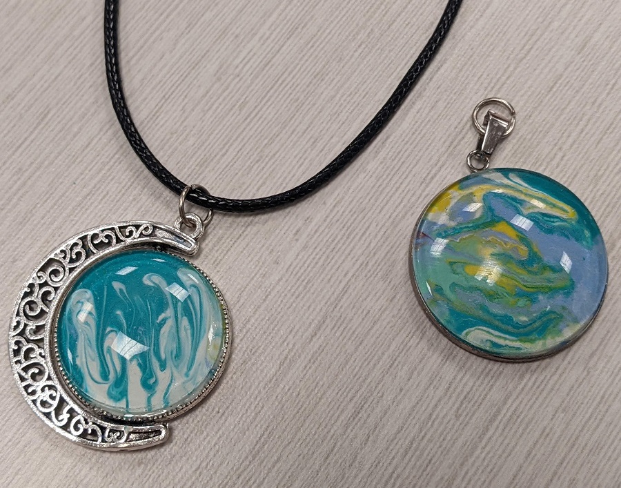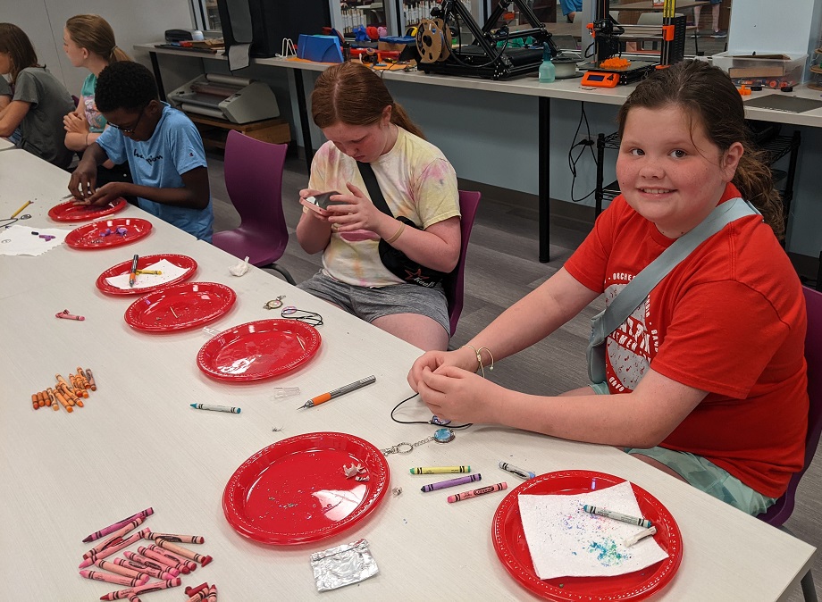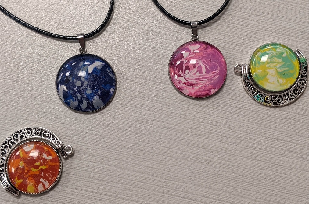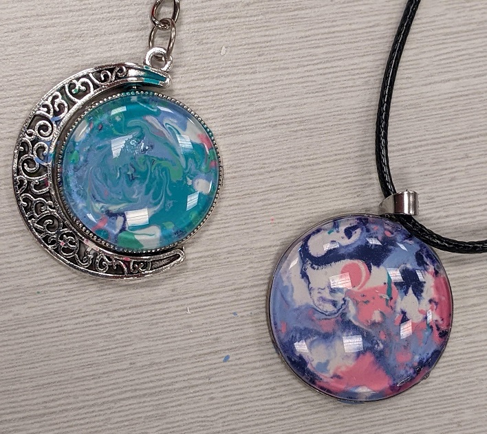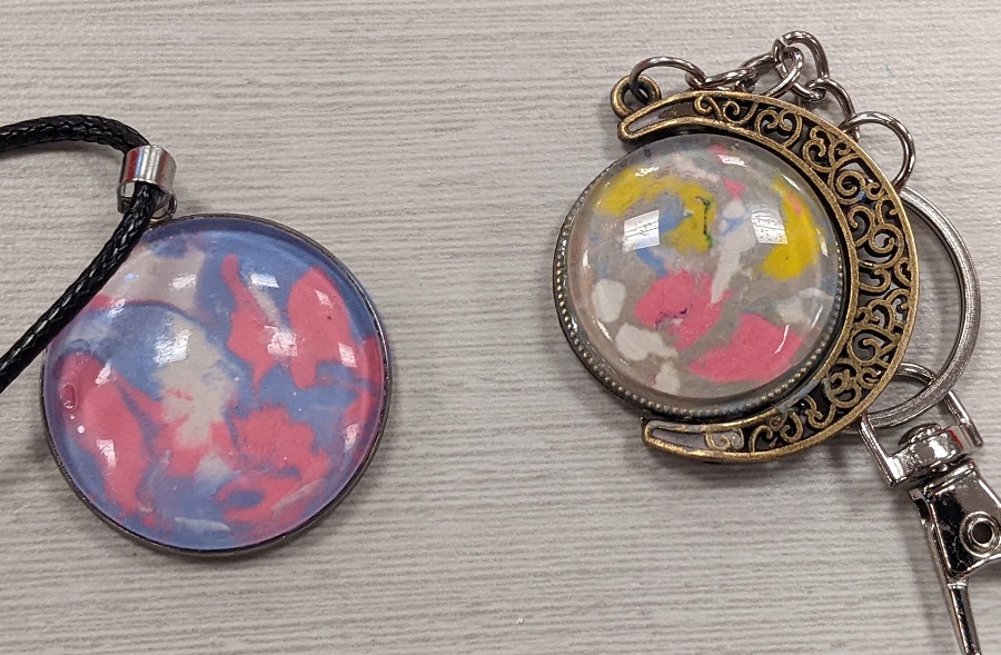In our Teen Try Its: Crayon Cabochon class, we discovered that you can make some pretty amazing pendants and keychains with melted crayons! The hardest part was probably chopping up the crayons into tiny pieces. Check out the Beautiful Things we made below: